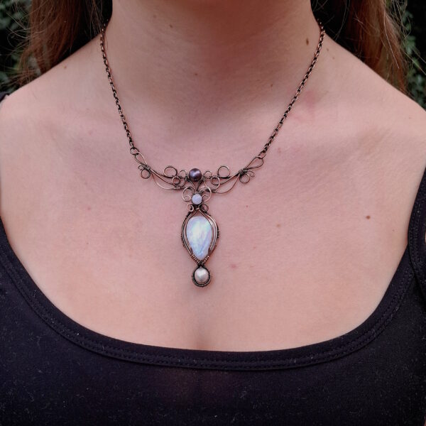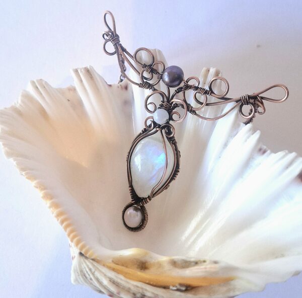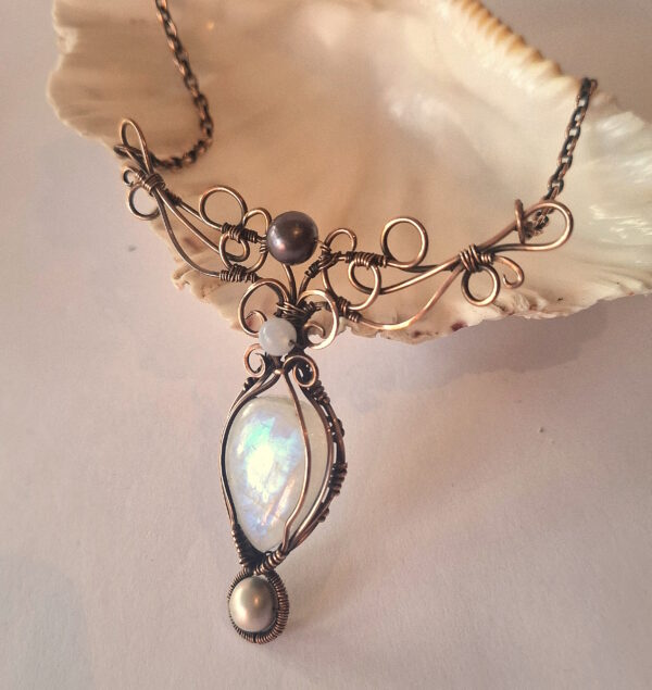 Materials: Rainbow Moonstone, Freshwater Pearls, Blue Lace Agate, Copper wire