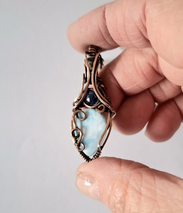 A stunning combination of these powerful blue stones, set in a flowing frame of copper. Larimar is all about accepting and flowing with change, having faith that what transpires is right for you. Sometimes we need to accept how things are at the moment and remember that change is constant so things will be different tomorrow! Sapphire is a beautiful stone for strength and fortitude, staying resilient in challenging times.