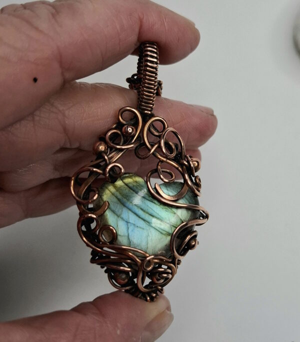 Stunning 100% natural Labradorite Heart with its beautiful aqua sheen! The amazing colour from Labradorite is emitted from the structure of this stone and is called its labradorescence. Such a magnificent and beautiful stone demanded an exquisite and powerful setting. The swirls and curls that transpired produced this voluptuous result. We are all a labyrinth of conscious and subconscious qualities and that is something to celebrate and integrate. The deep inner being of us is so much more than the outer. Labradorite is a powerful crystal to gain insights into your true inner self and your unique gifts from a higher perspective with focused meditation.