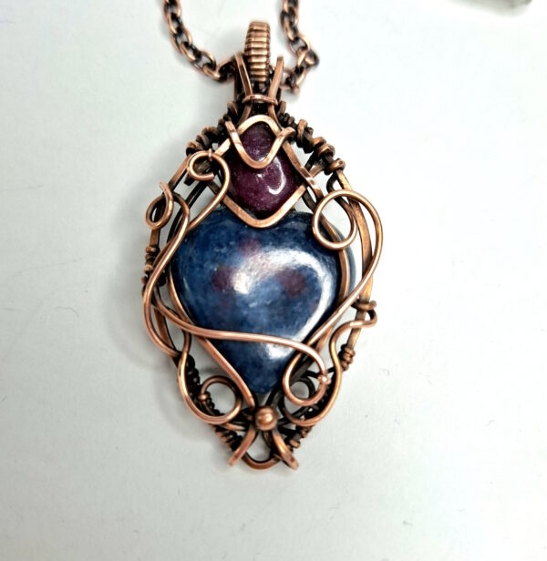 Statement Piece. This handcrafted pendant with its gentle swirls of copper wire represents our natural state; flowing and relaxed. Easing our way through life with ease and grace. A beautiful blue heart of Ruby In Kyanite with a large natural Ruby accent stone.