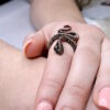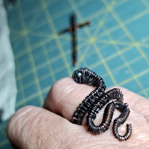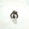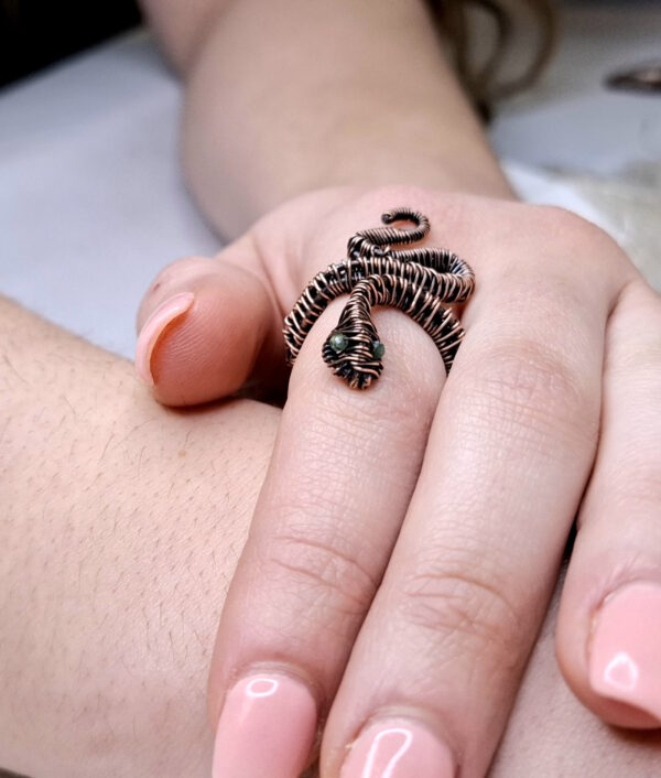 Featuring tightly woven copper from head to tail this ring is a powerful companion for your unique evolutionary path. Snakes are symbolic of life force energy; chi, or kundalini energy as it rises from Root to Crown Chakra – the upward spiral to transcendence. Leave the past behind – all you ever have is the here and now. Bring all the multidimensional and powerful aspects of you into this timeline with focus, strength, courage and joy. All possibilities are available to bring your vision to this plane!  The glistening Emerald eyes are a harmonising force, binding your head and heart energy for positivity and clarity and to forge ahead!