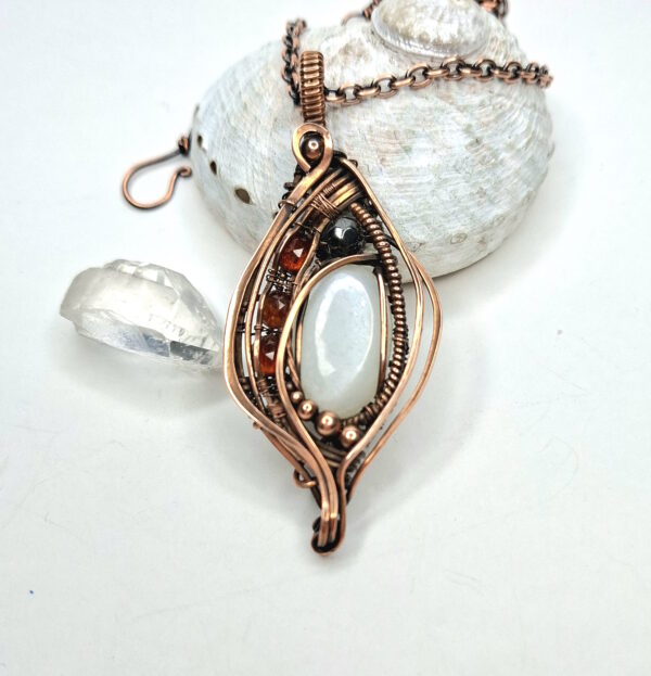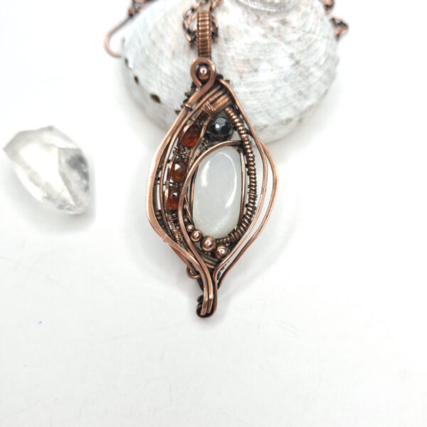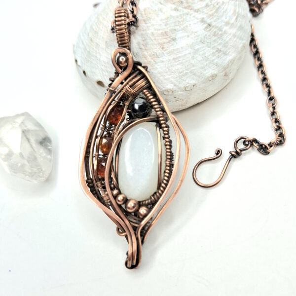Materials: White Moonstone, 3 faceted Garnets, Hematite, copper wire