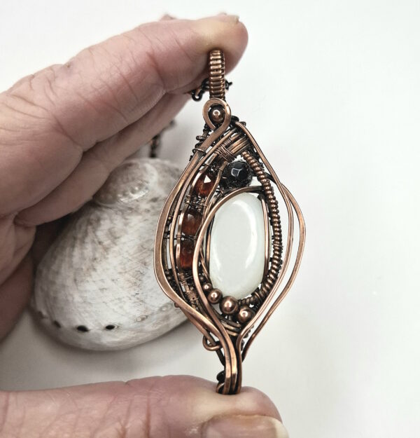 This item is a one-off piece hand wrapped in antiqued and polished solid copper wire. Purchase includes a complimentary 45cm antiqued and polished solid copper 3.1mm oval cable chain, care instructions, stone meaning, jewellery polishing pad and gift box.